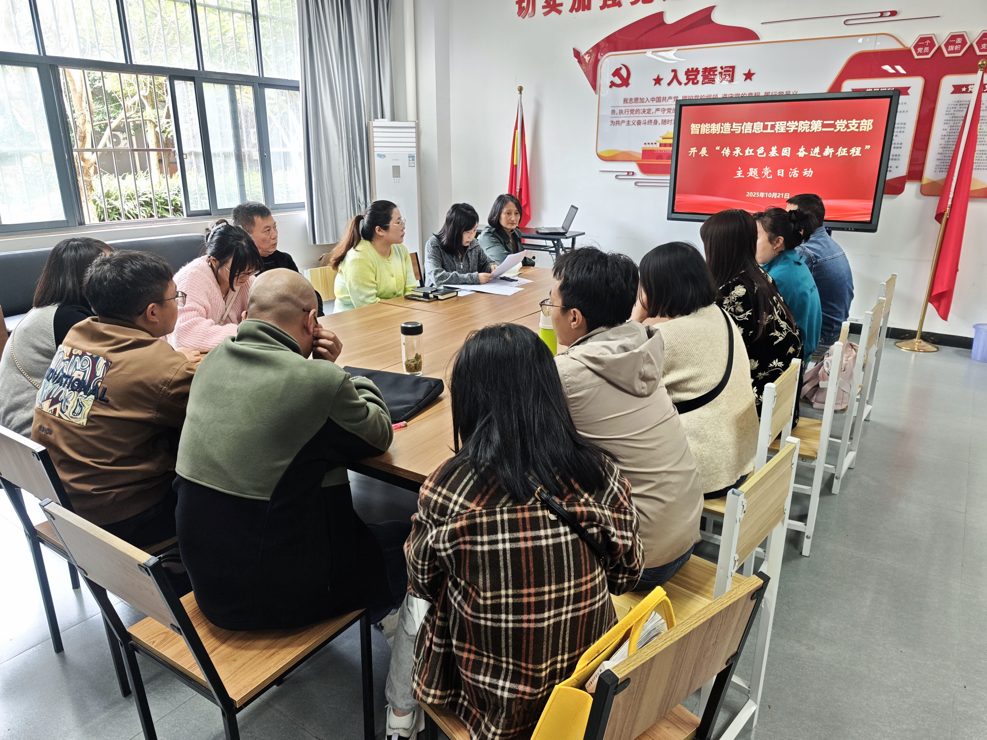 2025年10月21日中午,智能制造与信息工程学院党总支第二党支部在信息工程技术楼101党员活动室开展了“传承红色基因 奋进新征程”主题党日活动。通过多维学习与实践教育相结合的方式,引导全体党员教师们坚定理想信念、强化使命担当。
