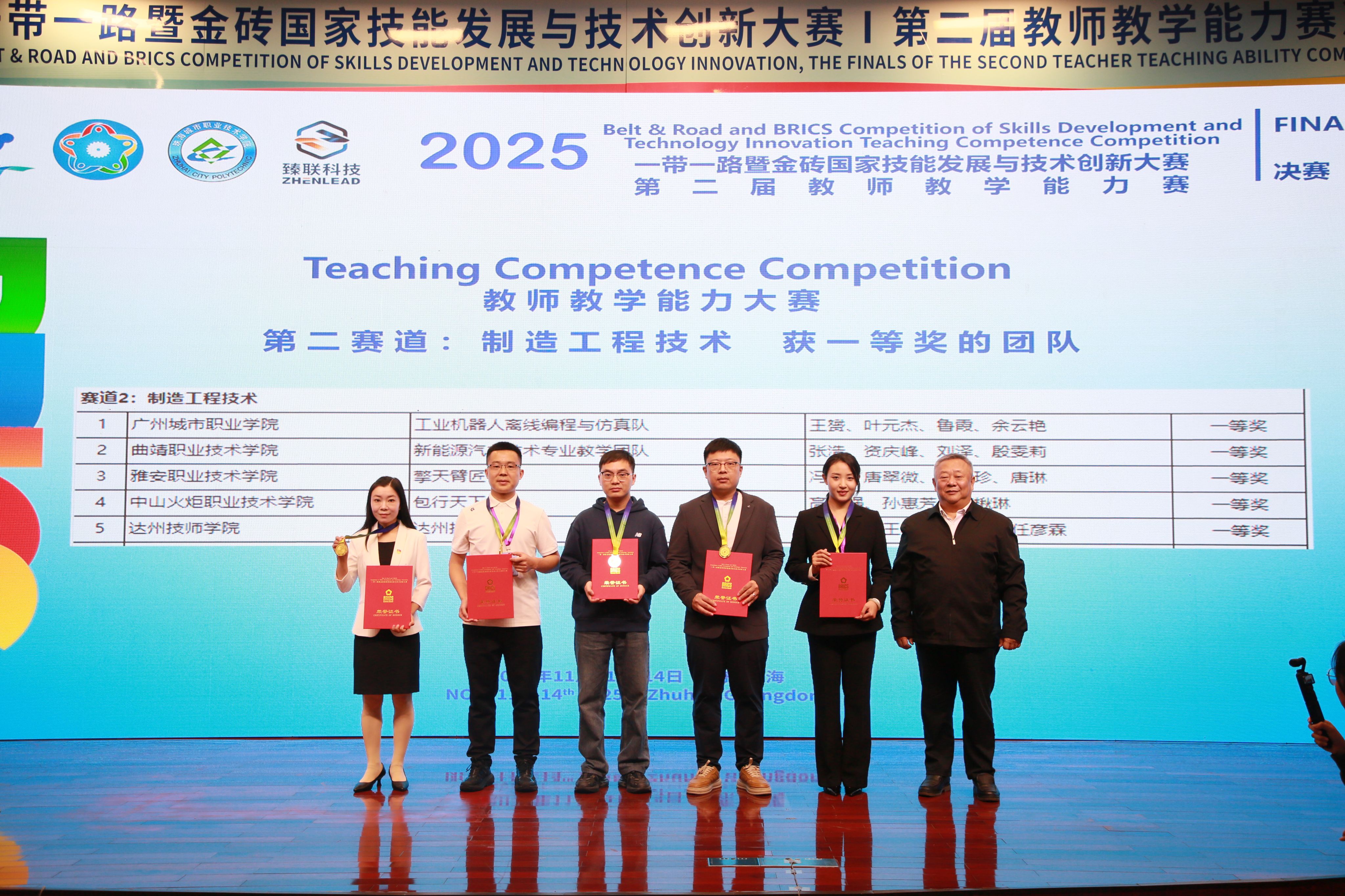 11月11日至14日,由金砖国家工商理事会技能发展应用技术与创新中方工作组、珠海城市职业技术学院等单位承办的“2025一带一路暨金砖国家技能发展与技术创新大赛第二届教师教学能力大赛总决赛”在广东省珠海城市职业技术学院顺利举行。本届比赛共有全国从选拔赛中脱颖而出的181支队伍进入总决赛,经过激烈地角逐,智信学院教师团队冯磊、唐翠微、杨晓珍、唐琳荣获‘制造工程技术赛道’一等奖。
