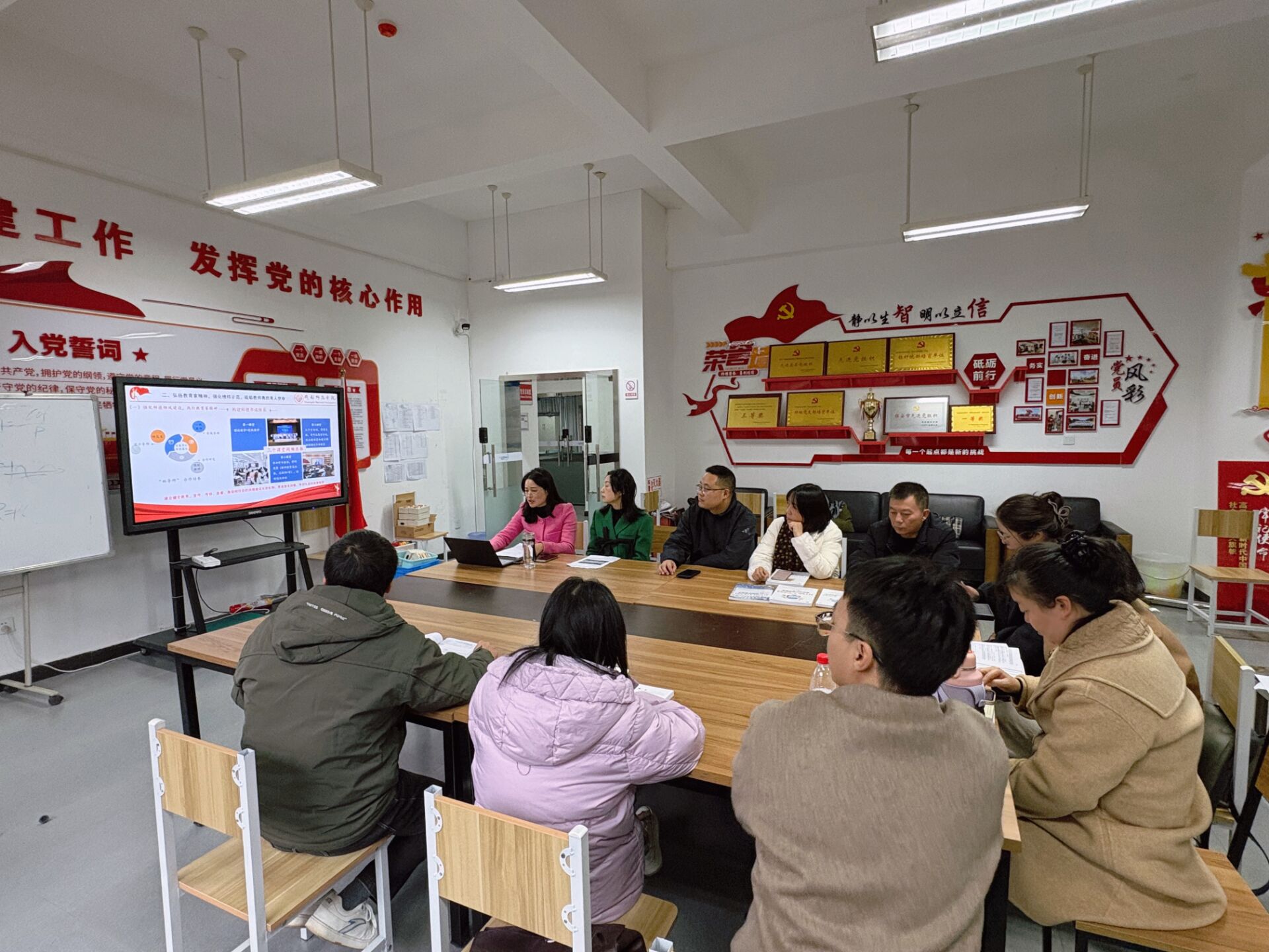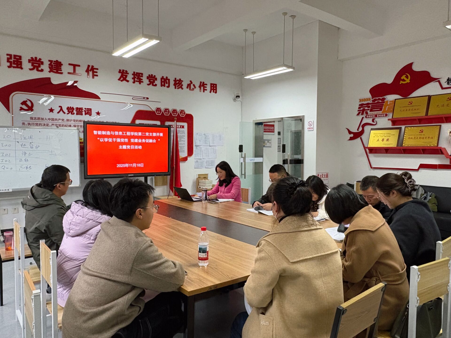 2025年11月18日下午,智能制造与信息工程学院党总支第二党支部在信息工程技术楼101党员活动室开展了“以学促干强党性 党建业务促融合”主题党日活动。本次活动旨在通过系统深入的理论学习和务实坦诚的研讨交流,进一步提升党员教师的政治理论素养与业务融合能力。